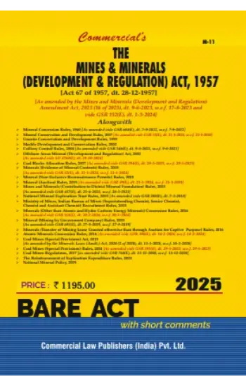 Mines and Minerals (Development and Regulation) Act, 1957: As Amended by the Mines and Minerals (Development & Regulation) Amendment Act, 2024 Description: Explore the comprehensive legal framework governing the mining industry in India with this essential text on the Mines and Minerals (Development and Regulation) Act, 1957, updated by the 2024 Amendment. This book provides a detailed and authoritative examination of the Act, offering valuable insights into the legislative changes and their implications for the mining sector. Key Features: Complete Text: Full reproduction of the Mines and Minerals (Development and Regulation) Act, 1957, including all amendments up to 2024. Expert Commentary: In-depth analysis of the Act’s provisions and the recent amendments, highlighting key changes and their impact on mining operations and regulation. Legal Insights: Practical guidance on compliance, regulatory requirements, and industry best practices in the context of the latest legal updates. Updated Information: Reflects the most recent legislative changes, including the Mines and Minerals (Development & Regulation) Amendment Act, 2024. Reference Material: Ideal for legal professionals, industry stakeholders, academics, and anyone seeking a thorough understanding of mining law in India. Whether you are a legal practitioner, mining industry professional, or a student of environmental law, this book provides the essential knowledge and context you need to navigate the complexities of India’s mining regulations.
