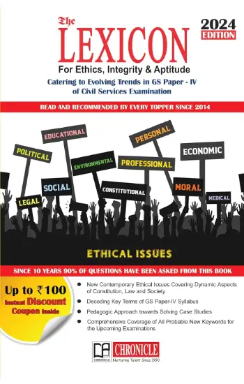6)The Lexicon for Ethics, Integrity & Aptitude 2024 :-Welcome to the tenth revised edition of “The Lexicon For Ethics, Integrity & Aptitude,” a comprehensive compendium meticulously crafted for students aspiring to excel in the UPSC Civil Services Examination, specifically addressing the syllabus of General Studies Paper IV. As the dynamic landscape of the UPSC examination evolves, so does our commitment to provide students with an updated and comprehensive resource that aligns seamlessly with the changing patterns of the examination. This edition decodes the key terms of the syllabus for easier understanding of the discipline by the students. Over the past three years, “Lexicon” has been progressively adapting itself to cater to the evolving demands of the UPSC examination. In this tenth edition, we continue our journey of refinement, incorporating subject matter that reflects the latest developments and emerging trends in the fields of ethics, public life, society, and governance. Originally designed to acquaint students with the academic discourse of GS Paper IV, “Lexicon” has undergone substantial revisions and enrichments in its dimensions and depth. Given the dynamism of the syllabus and the agile demand of the examination, new topics and dimensions like Moral Intuition, Ethical Altruism, Principle of Non- Refoulement, etc. have been added in the present edition. The book now addresses not only the core principles of ethics but also explores new and pertinent topics such as constitutional and legal issues, along with contemporary ethical issues like Moonlighting, Homosexual Marriage Rights, Begging, and Prostitution, etc. Recognising the ever-growing complexities of the examination, this edition delves deeper into the psychology of dealing with case studies. It aims to ensure that students not only comprehend the ethical principles but also develop the psychological aptitude necessary for effective decision-making, aligning them with the qualities of a successful civil servant. The tenth edition not only deals with the approach to solve the case studies but also ensures that students get a glimpse into concepts of GS Paper IV while addressing the case studies. This will help develop the required aptitude and orientation as per the demand of the examination. The GS Paper IV demands more than just an understanding of ethics paper; it requires individuals to align their behaviour with ethical principles in their daily lives. To meet this expectation, the book has been revised and reconceptualised since its inception by Chronicle Editorial Team, incorporating their rich experiences and expertise. Their valuable insights gained through years of research have transformed this edition into a comprehensive and holistic solution for students, providing them with a one-stop reference for mastering the intricacies of GS Paper IV. We hope that “Lexicon For Ethics, Integrity & Aptitude” serves as an invaluable companion in your journey towards success in the UPSC Civil Services Examination. May this edition empower you with the knowledge, aptitude, and ethical acumen required to navigate the challenges and emerge as a responsible and effective civil servant.