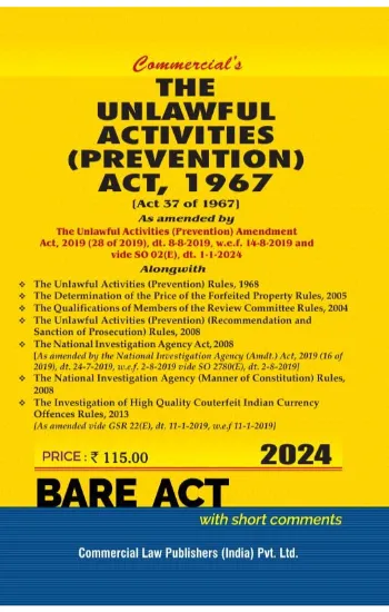 UNLAWFUL ACTIVITIES (PREVENTION) ACT, 1967, [Act 37 of 1967] As amended by The Unlawful Activities (Prevention) Amendment Act, 2019 (28 of 2019), dt. 8-8-2019, w.e.f. 14-8-2019 and vide SO 02(E), dt. 1-1-2024 Alongwith The Unlawful Activities (Prevention) Rules, 1968 The Determination of the Price of the Forfeited Property Rules, 2005 The Qualifications of Members of the Review Committee Rules, 2004 The Unlawful Activities (Prevention) (Recommendation and Sanction of Prosecution) Rules, 2008 The National Investigation Agency Act, 2008 [As amended by the National Investigation Agency (Amdt.) Act, 2019 (16 of 2019), dt. 24-7-2019, w.e.f. 2-8-2019 vide SO 2780(E), dt. 2-8-2019] The National Investigation Agency (Manner of Constitution) Rules, 2008 The Investigation of High Quality Couterfeit Indian Currency Offences Rules, 2013 [As amended vide GSR 22(E), dt. 11-1-2019, w.e.f 11-1-2019]