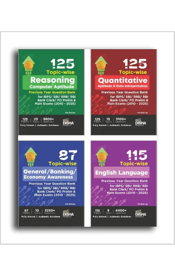 The thoroughly revised & updated 9th edition of the Combo (set of 4 Books) 125 Reasoning/ Quantitative Aptitude/ English/ General Awareness Topic-wise Previous Year Solved Papers for IBPS/ SBI Bank PO/ Clerk Prelim & Main Exams (2010 – 25) consists of past solved papers for Prelim and Main Exams of Banks – IBPS PO, IBPS Clerk, SBI PO, SBI Clerk, IBPS RRB PO, IBPS RRB Office Assistant and RBI Assistant from 2010 to 2025.