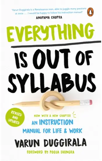 Life seldom comes with an instruction manual or a guidebook. It’s often messy and unpredictable too. While our education may prepare us for situations covered within its set syllabus, most of life happens outside this realm and this leaves us grappling with questions around work, life and everything in between. Hence, this book. Varun Duggirala has survived and thrived in a system that throws curveballs at us without the tools to actually overcome them. In Everything Is Out of Syllabus, he offers answers to important questions like: What is the true meaning of success? How can one become more creative and think outside the box? How can we connect with people, including ourselves? And much more. Most importantly, he tells readers what are the skills one needs to master to live a more fulfilled life that is optimized for happiness. Full of anecdotal wisdom, this book is partly funny, mostly reflective, and completely authentic. Everything Is Out of Syllabus is a must read for anyone who is trying to understand life and figure out their own roadmap to navigate it.