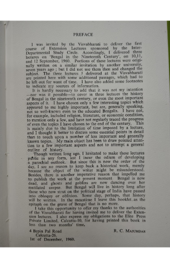 Majumdar makes it clear in his Preface that the lectures were not intended as a comprehensive history of nineteenth-century Bengal. Instead, he chose a few significant themes that appeared to him to be both important and often neglected, even by educated Bengalis. He deliberately avoided attempting a broad outline of history, preferring instead to offer pointed discussions of crucial issues. Some topics such as religion, literature, and economic conditions are not covered in depth, largely due to the constraints of the lecture format.